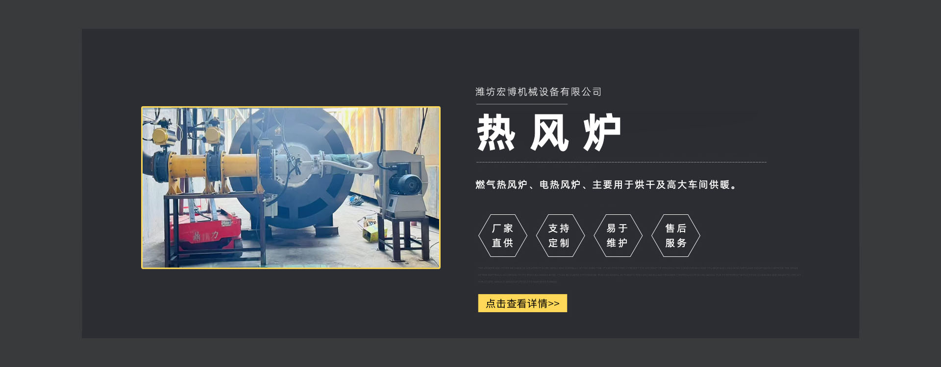 濰坊宏博機械設備有限公司是從事熱風爐、烘干設備、供暖設備的研發、設計、制造和服務于一體的實體企業。長期以來,企業以市場的發展和客戶的需求為導向,集多年的生產技術與經驗為一體,不斷開發和優良產品。